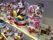 中身にもこだわっており、紙おむつをケーキに見立て、 ぬいぐるみ、おもちゃ、ボディースーツ、スタイ、靴下、哺乳瓶、マグなど、出産してからすぐ実際に使える実用的な物だけをセレクトしています。