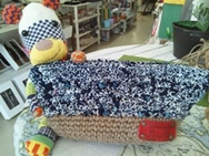 | 2Fで制作している革商品 革のネックレス・チャーム・キーホルダー等、アンティーク感を出した作品に仕上げています。 | 作家さん作品 トイレットペーパーのカバーです。 色々な表情の作品があり、とても面白くて可愛い作品です。 | 作家さん商品 モチーフ編みのマフラー。 色々な色を組み合わせていてカラフルで元気になります。 |