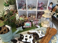 花柄やレースのかわいい雰囲気の布雑貨、メラニン素材の雑貨などを中心に、ビーズアクセサリー、布小物、ペーパークラフトバック、ハンコ、ロマンチックな感じの布雑貨、ガーデニングピック・お家風木箱などの木工作品、フォトフレーム、時計、フェルトにカラフルな刺繍糸で丁寧に刺繍を行い、羊毛フェルトボールと組み合わせたオリジナルヘアゴム、刺繍を施したサイドファスナーバック、はかり・おたま・れんげなどのキッチン雑貨、かわいい収納ボックス、トイレットペーパーのカバーなど、様々なテイストの作品を揃えています。