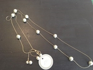 | 布を染めるところからこだわって作ったコサージュです。フォーマルにはもちろん、カジュアルにあわせてもカワイイコサージュです。 | 軽いコットンパールを使ったロングネックレスです。パールは自由に動かせます。シンプルなので、重ねづけしても可愛いです。 |