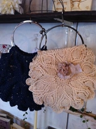 | リバティプリントを使った小銭入れ。プレゼントにも人気です。 | 手編みのプチバック。パーティーにでも使えるバック。レース編みは意外と着物にも似合います。 |