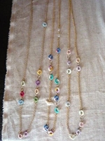 | チェーンに直接糸を編みつけて作りました。色はたくさん使っていますが、華奢なデザインなのでお洋服を選びません。チェーンに直接編んであるため、丈夫。編み物作品だが、季節を選ばない。 |