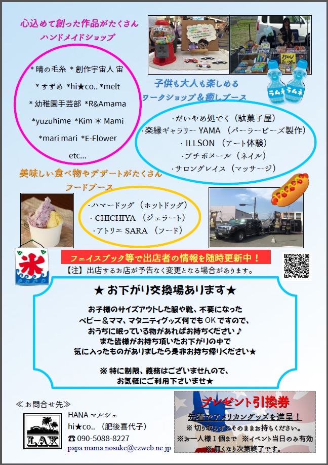 | 問い合わせ先 | アメリカン雑貨とカフェの店LAX 担当:堀 ☎0949‐26‐7001(営業時間11:00-19:00 火曜定休) ✉american_zakka_lax@yahoo.co.jp HANAマルシェ 担当:hi★co.. (肥後) ☎090-5088-8227 ✉papa.mama.nosuke@ezweb.ne.jp |