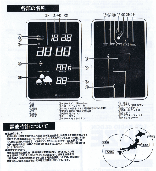素材 機能:電波時計、アラーム・スヌーズ機能、 12h/24h表示切替、室温・湿度、天気予測表示、バックライト明るさ調節